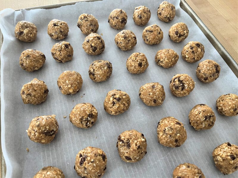 3. Use a 1″ cookie scoop to scoop equal-size portions of the oat mixture onto parchment-lined cookie sheets.