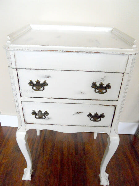Hi Candace, I usually use a tinted wax over anything I want to distress — so any color paint I use (usually Antique White from Bher) is applied, left to dry, and then rubbed with a darker wax to give it more of an aged look.